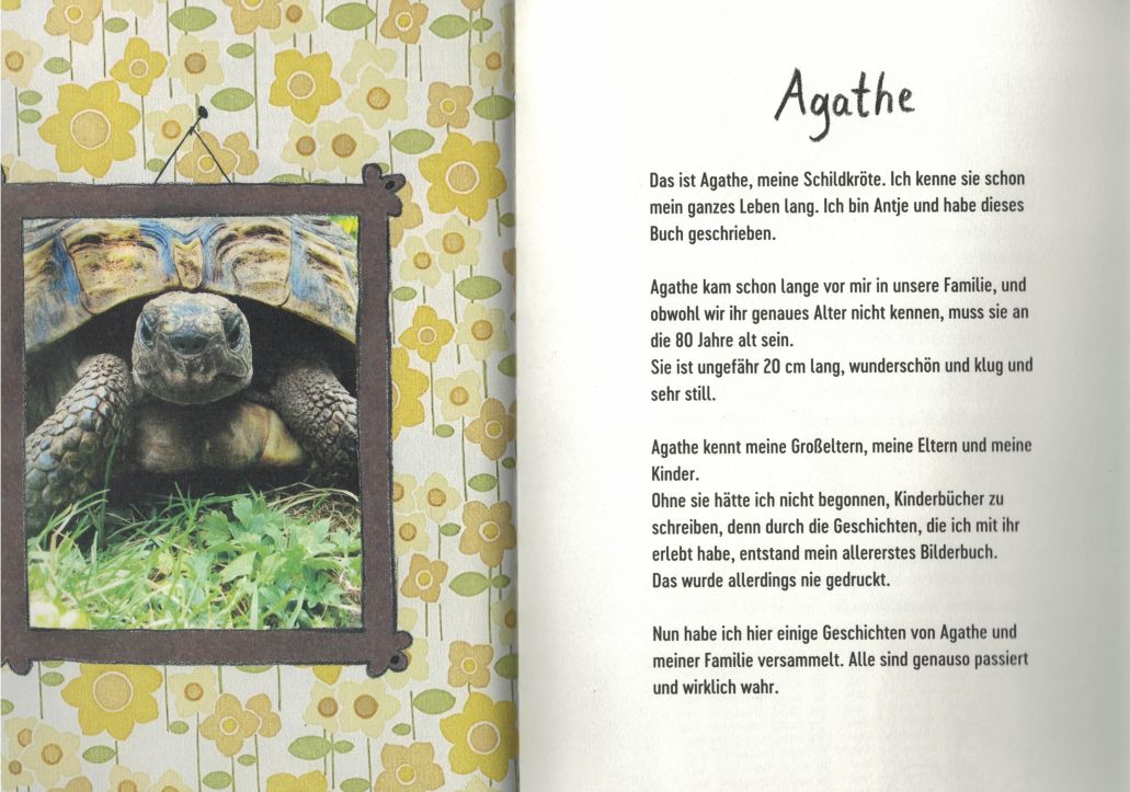 Agathe ist eine griechische Landschildkröte, die seit 80 Jahren zu Antje Damms Familie gehört. Sie hat bereits Antjes Oma erlebt und kennt inzwischen Antjes Kinder. Dieses Buch erzählt davon, wie Agathe die Winter im Kühlschrank verbringt, wie sie sich mit einer Taube anfreundete und einmal wochenlang verschunden war.