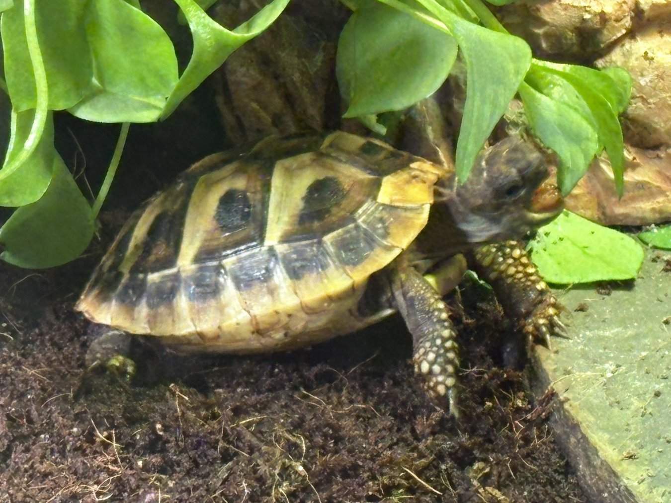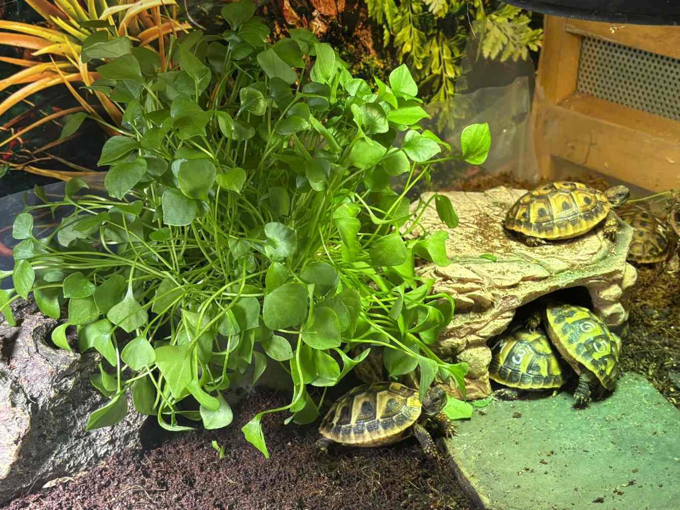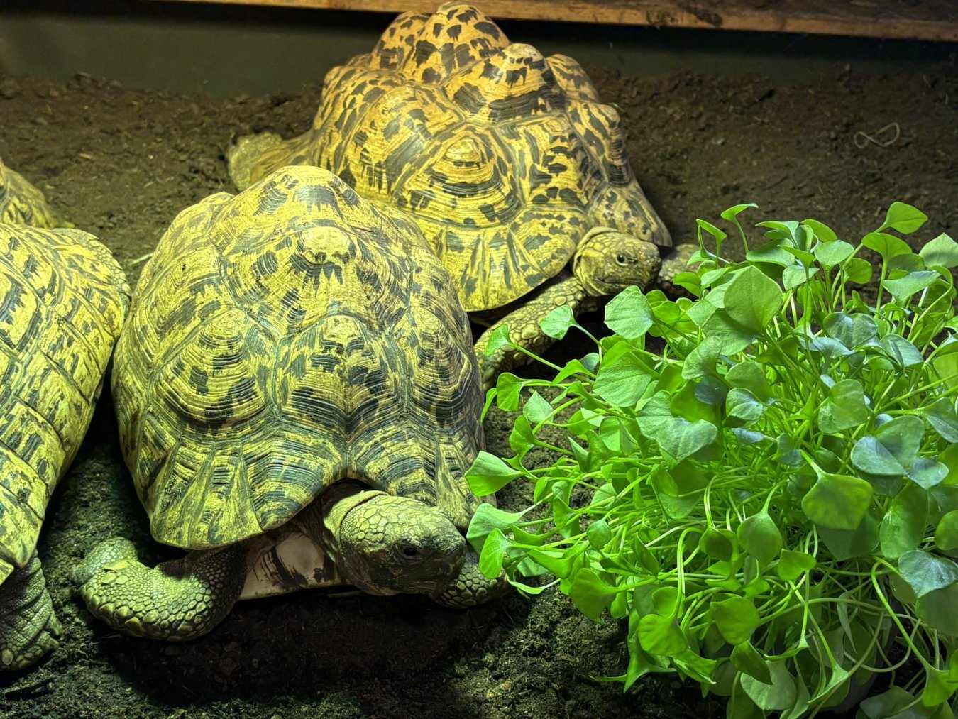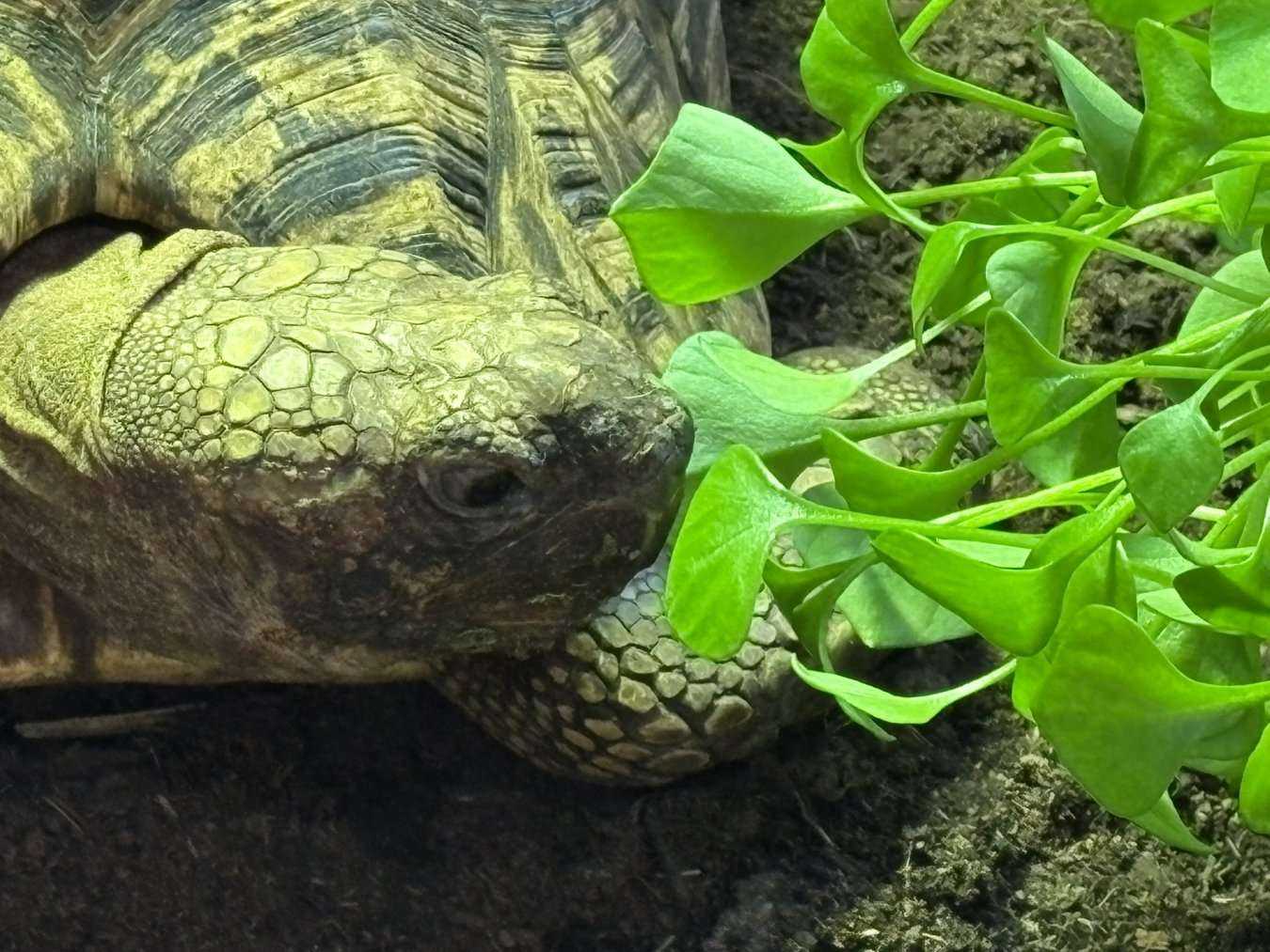 Unsere winterwachen Pantherschildkröten sowie die schon wieder wachen Jungtiere griechischer Landschildkröten machen sich sehr schnell über die kleinen, feinen, vitaminreichen Blätter her. |