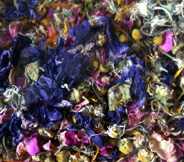 Inhalt: Ringelblumenblüten, Rosenblüten rosa, wilde Malvenblüten,Kamillenblüten, Gänseblümchenblüten, Vogelmierekraut fein
