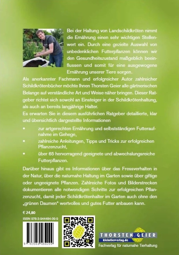 Bei der Haltung von Landschildkröten nimmt die Ernährung einen sehr awichtigen Stellenwert ein. Durch eine gezielte Auswahl von unbedenklichen Futterpflanzen können wir den Gesundheitszustand maßgeblich beeinflussen und somit für eine ausgewogene Ernährung unserer Tiere sorgen. Als anerkannter Fachmann und erfolgreicher Autor zahlreicher Schildkrötenbücher möchte Ihnen Thorsten Geier alle gärtnerischen Belange auf verständliche Art und Weise näher bringen. Dieser Ratgeber richtet sich sowohl an Einsteiger in der Schildkrötenhaltung, als auch an bereits langjährige Halter.