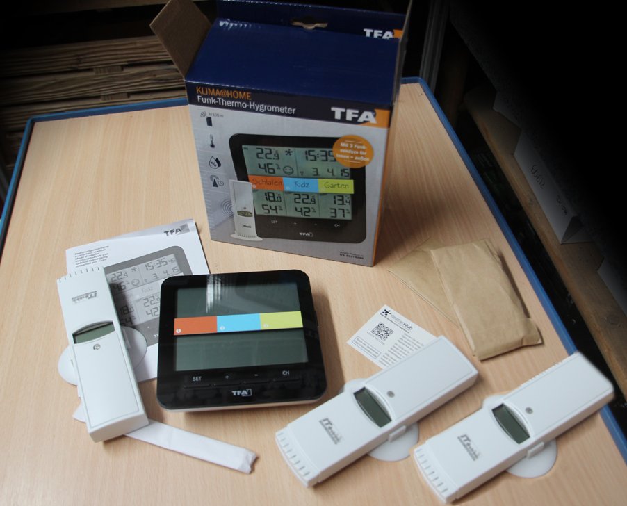 Mit den drei mitgelieferten Funksendern lassen sich Temperatur und Luftfeuchtigkeit außer am Aufstellort noch in weiteren Räumen (Schlafzimmer, Kinderzimmer, Keller, Wintergarten…) oder im Außenbereich messen.
