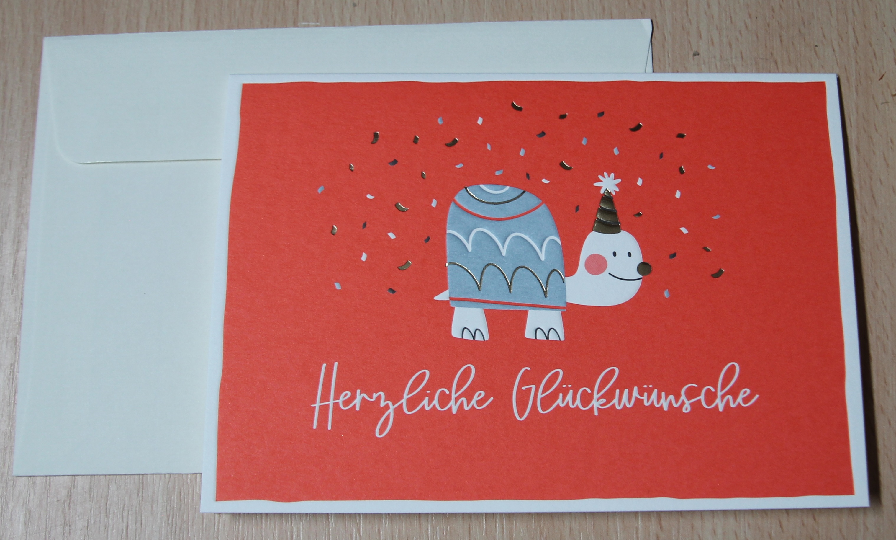 Wunderschöne liebevoll gestaltete orangfarbene Grußkarte mit feiernder Schildkröte und einem passenden Umschlag. Das Papier ist hochwertig verarbeitet und teilweise geprägt, sodass einzelne Elemente leicht erhaben wirken. Die edlen Goldelemente und die harmonische Farbgestaltung verleihen dem Design eine besondere Note.