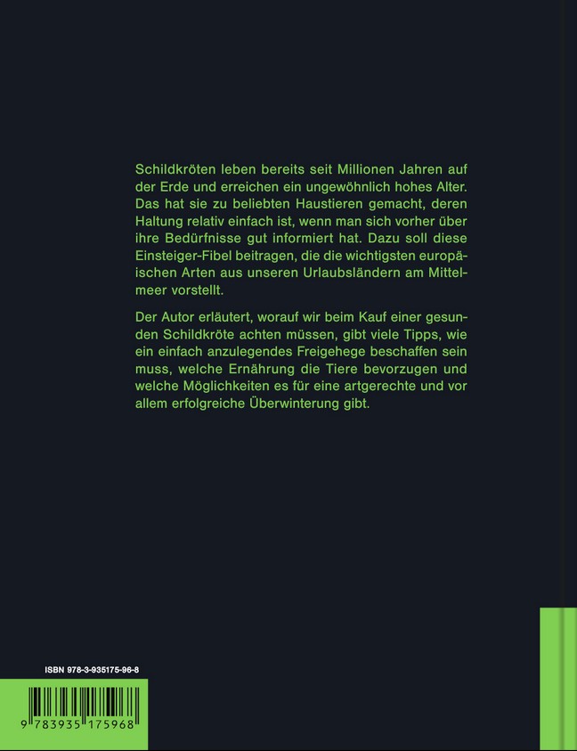 Schildkröten sind beliebte Haustiere, denn sie erreichen ein ungewöhnlich hohes Alter, und ihre Haltung gilt als relativ einfach. Das stimmt auch – wenn man sich vorher über die Bedürfnisse der Tiere gut informiert hat. Dazu will diese Fibel beitragen. Der Einsteiger-Ratgeber beantwortet alle wichtigen Fragen zu Haltung und Pflege: Worauf ist beim Kauf eines Tieres zu achten? Wie lässt sich ein einfaches Freigehege anlegen, und wie sollte es beschaffen sein? Welche Ernährung bevorzugen die Tiere? Und welche Möglichkeiten gibt es für eine artgerechte Überwinterung?