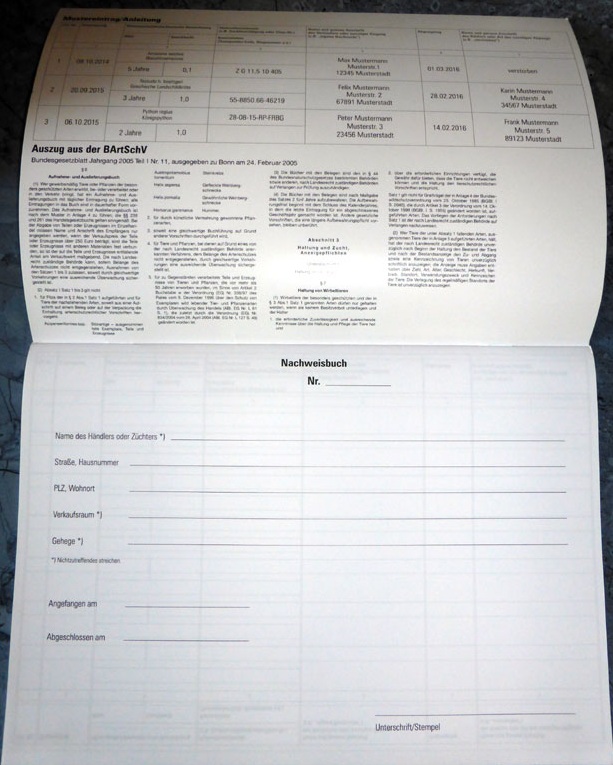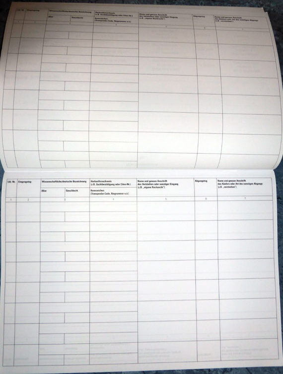 Über artgeschützte Tiere ist Buch zu führen. Jeder, der Jungtiere von Artgeschützten Tieren besitzt und diese abgibt muss nachweisen wem und wann er welches Tier (Papiernummer) gegeben hat. Dieses Buch erleichert diese Dokumentation und das Einhalten von gesetzlichen Vorgaben.