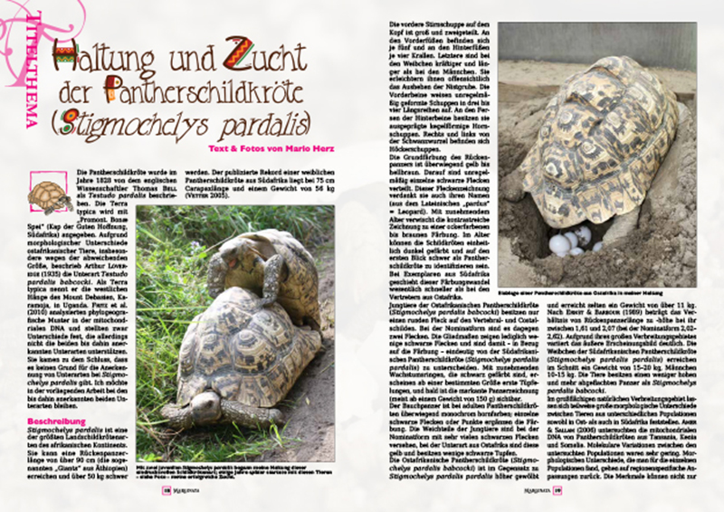 Die Pantherschildkröte, Stigmochelys pardalis, ist ein dankbarer Pflegling für Schildkrötenfreunde mit viel Platz. Ihr war vor 15 Jahren schon einmal ein Titelthema in der MARGINATA gewidmet. Höchste Zeit also, diesen attraktiven und beeindruckenden Panzerträger noch einmal näher zu beleuchten, über die Art in der Natur und in Menschenobhut aktuell und fachkundig zu informieren.
