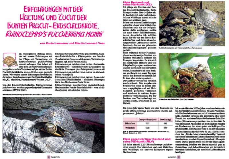 Erfahrungen mit der Haltung und Zucht der Bunten Pracht-Erdschildkröte, Rhinoclemmys pulcherrima manni (Karin Laumann & Martin Leonard Voss)