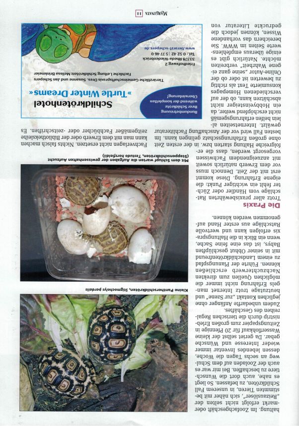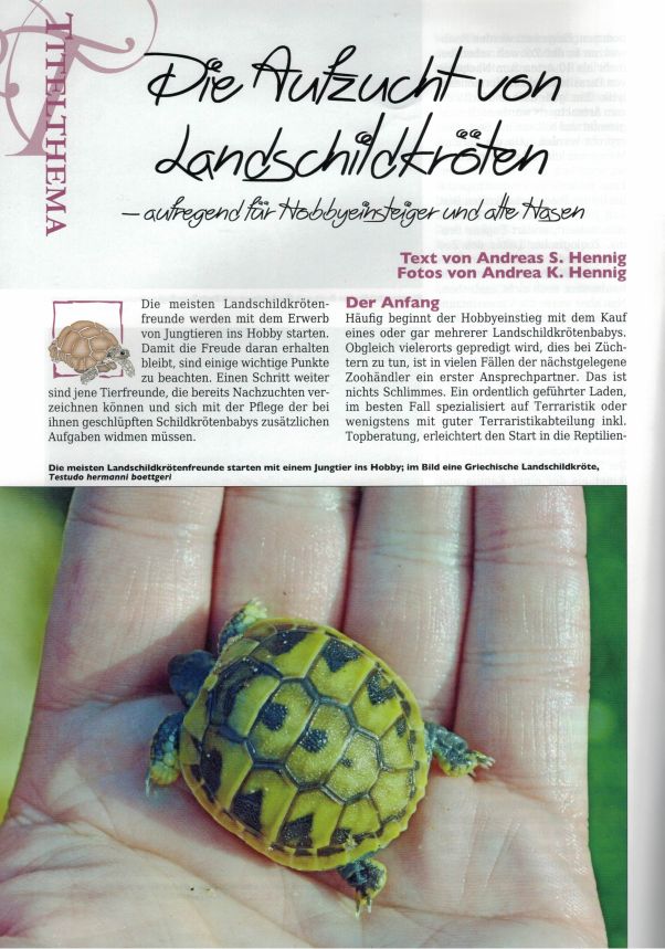 Die meisten Landschildkrötenfreunde werden mit dem Erwerb von Jungtieren ins Hobby starten. Damit die Freude daran erhalten bleibt, sind einige wichtige Punkte zu beachten. Einen Schritt weiter sind jene Tierfreunde, die bereits Nachzuchten verzeichnen können und sich mit der Pflege der bei ihnen geschlüpften Babys zusätzlichen Aufgaben widmen müssen. Die MARGINATA informiert im Titelthema über zahlreiche Aspekte der Aufzucht von Landschildkröten.