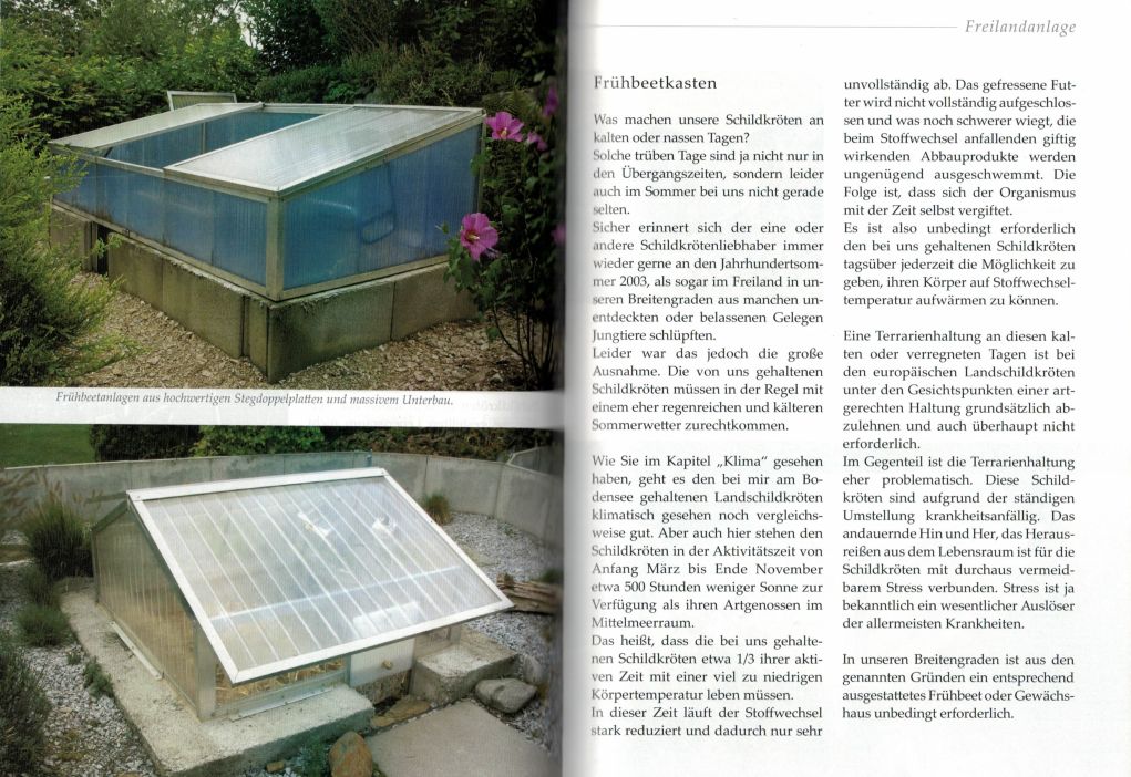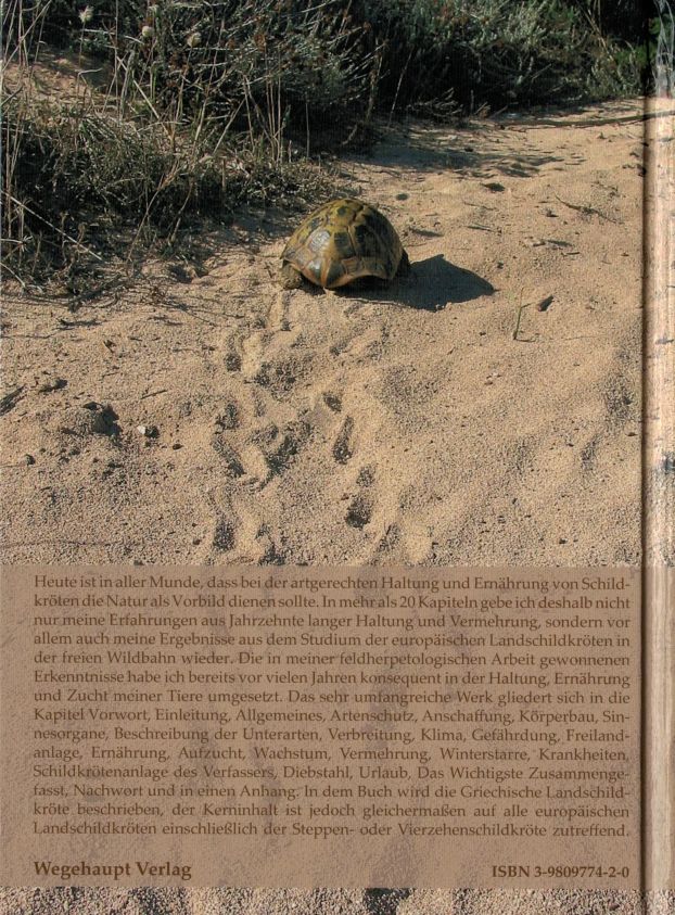 Heute ist in aller Munde, dass bei der artgerechten Haltung und Ernährung von Schildkröten die Natur als Vorbild dienen sollte. In dem umfassenden Buch gibt der Autor deshalb nicht nur seine Erfahrungen aus Jahrzehnte langer Haltung und Vermehrung, sondern vor allem auch seine Ergebnisse aus dem Studium der europäischen Landschildkröten in der freien Natur wieder. Die in mehr als 50 Jahren feldherpetologischer Arbeit gewonnenen Erkenntnisse habt er von Anfang an konsequent in der Haltung, Ernährung und Zucht meiner Tiere umgesetzt. Die daraus entstandene Haltungsform, insbesondere die naturnahe Gestaltung der Gehege, ist mittlerweile bei allen engagierten Haltern zum Wohl der Schildkröten zum Standard geworden und prägt heute die meisten Publikationen und Internetpräsentationen über die artgerechte Haltung der europäischen Landschildkröten. Das Buch vermittelt aus erster Hand ausführlich und übersichtlich das zur artgerechten Haltung und Vermehrung von europäischen Landschildkröten erforderliche Wissen und lässt keine Fragen offen. Es gliedert sich in die Kapitel Vorwort, Einleitung, Allgemeines, Artenschutz, Anschaffung, Körperbau, Sinnesorgane, Beschreibung der Unterarten, Verbreitung, Klima, Gefährdung, Freilandanlage, Ernährung, Aufzucht, Wachstum, Vermehrung, Winterstarre, Krankheiten, Schildkrötenanlage des Verfassers, Diebstahl, Urlaub, Das Wichtigste Zusammengefasst, Nachwort und in einen Anhang. In dem Buch wird die Griechische Landschildkröte beschrieben, der Kerninhalt ist jedoch gleichermaßen auf alle europäischen Landschildkröten einschließlich der Steppen- oder Vierzehenschildkröte zutreffend.
