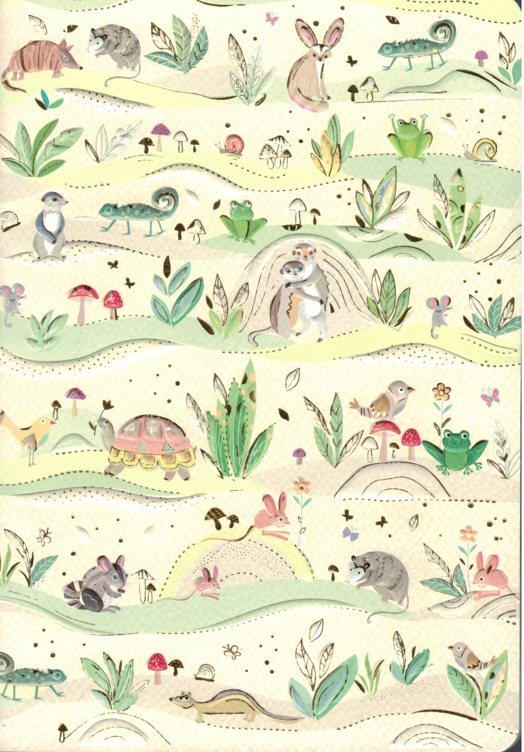 Wunderschönes liebevoll gestaltetes hochwertiges Notitzbuch mit verschiedenen Tieren: Schildkröten, Chamäleon, Frosch, Erdmännchen, Schnecken, Maus, Vogel und einigen mehr. Das Papier ist hochwertig verarbeitet und teilweise geprägt, sodass einzelne Tiere und Pflanzen leicht erhaben wirken. Die edlen Goldelemente und die harmonische Farbgestaltung verleihen dem Design eine besondere Note.