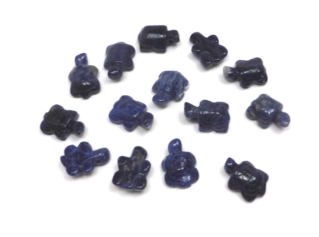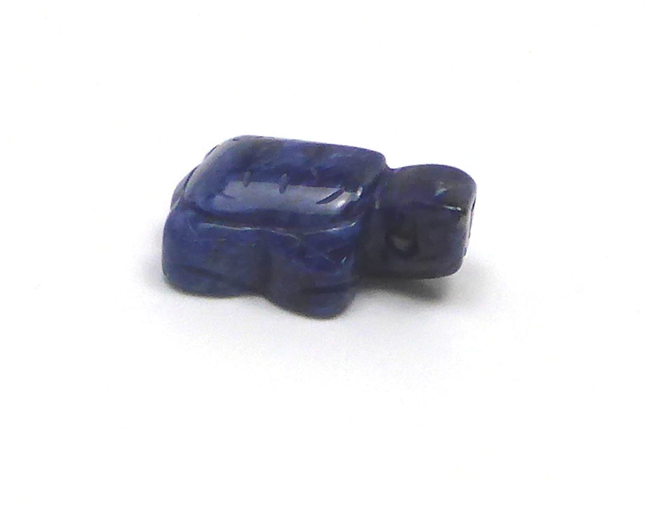 Schöner ca. 2,5 cm großer Kettenanhänger aus Sodalith in Form einer Landschildkröte. Wie auf den Artikelbildern zu sehen ist, kann die Farbe etwas variieren. Die Panzerstukturen sind fein fühlbar angedeutet.