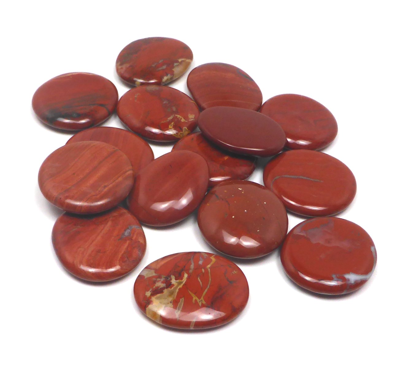 Der Halbedelstein roter Jaspis ist eine undurchsichtige Varietät des Quarzes (Chalcedon), die durch Eisenoxide ihre charakteristische Farbe von Ziegel- bis Blutrot erhält, meist ist er mit hellen Streifen durchzogen.