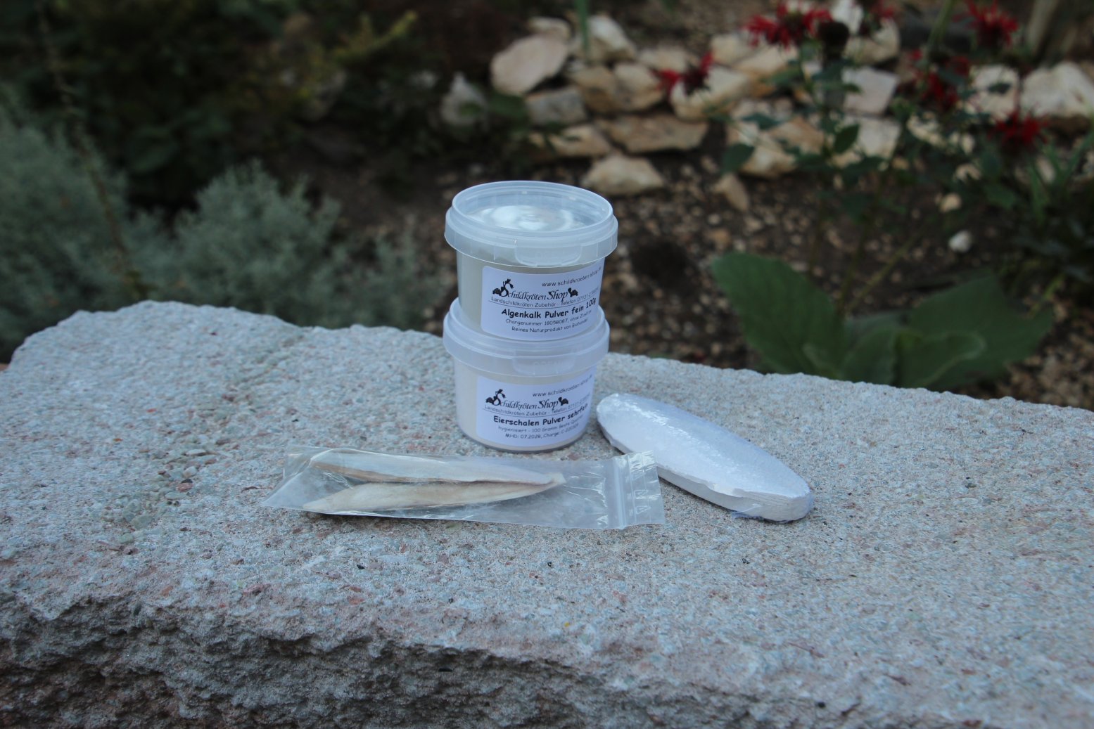 Set aus Algenkalk 100g, Eierschalenpulver 100g, Sepiaschale (2er klein) und Calciumstein