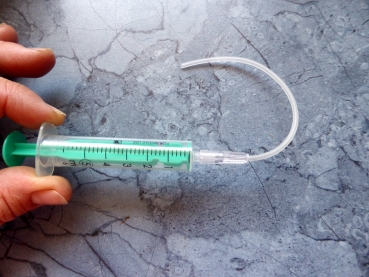Spritze mit Aufsatz und Schlauch zum Eingeben von Medizin