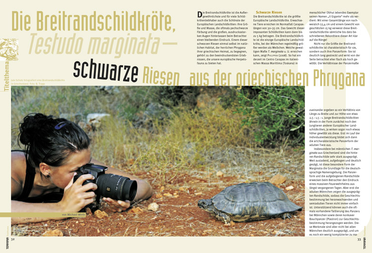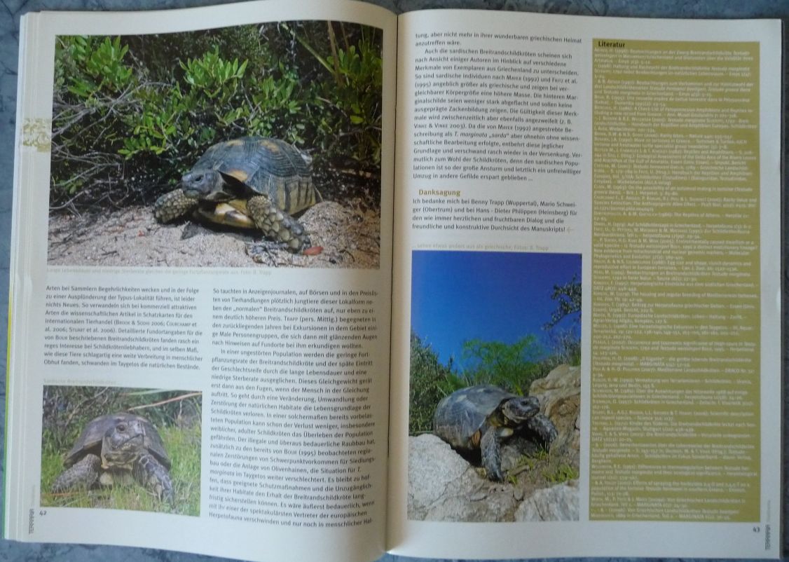 Außerdem stellen wir ein Schutzprojekt für Schildkröten der Stadt Murcia in Spanien vor, berichten über Breitrandschildkröten (Testudo marginata) in Griechenland sowie über die Dalmatinische Landschildkröte (Testudo hermanni hercegovinensis).